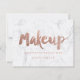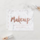 A modern, stylish gift certificate makeup artist business card with modern hand lettering style brush typography in faux rose gold foil on a trendy and elegant white marble background.