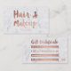A modern, stylish gift certificate hair and makeup makeup artist card with modern hand lettering style brush typography in faux rose gold foil on a trendy and elegant white marble background.