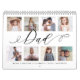 Send a beautiful personalised gift to your father (dad) that he'll cherish. Special personalised family photo collage calendar to display your own special family photos and memories. The front cover design features a simple 8 photo collage grid design with "Dad" designed in a beautiful handwritten black script style. Each photo is framed with a simple gold-coloured frame. Customise with family members' names. Each month features a single full-size image with the month written in elegant black calligraphy displayed slightly over each photo.