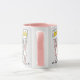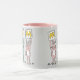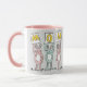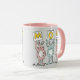 Fun Mug for Mum. Fun Rabbit Design Pink and White Mug with illustration of Rabbits in pink and blue. Mother's Day gift mug. Cute baby rabbits. The rabbits are holding up cards to spell out the word MOM.