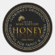 Black Label with the word HONEY written & reflected in metallic gold on black background with double gold and dotted border. Realistic honeybee makes label stand out. Pre-calculated list of honey net weight conversions included in form field. Editable text in a curved border for Apiary or Beekeeper's name, and gift message.