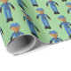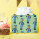 Baseball playing doll, dressed in blue uniform. Character wears blue cap with white letters. Tiled pattern on pale green background.