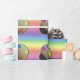 The six primary colours (purple, blue, green, yellow, orange, red) are arrayed on the painter's pallet that is multiplied over the paper. Background is of rainbow colours in horizontal stripes.
