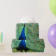 Brilliant blue peacock has his tail feathers spread across the entire surface of the paper.