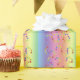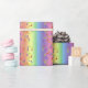 Blended vertical stripes in rainbow colours form the background. Dots of various colours snake around randomly. Dots are primary colours of purple, blue, green, yellow, orange and red