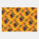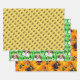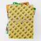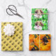 Bee on honey comb cells, is replicated on an angle across pale yellow background on first sheet. Second sheet shows yellow and brown honeybee collecting pollen from a pink clover blossom. Third sheet shows black and yellow bumble bee on orange calendula blossom. All three images are tiled across the paper.