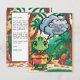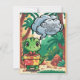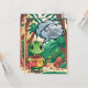 A cute dinosaur baby presenting a gift to the birthday kid in a pre-historic jungle. This is a lovely birthday greeting card for little kids who are into fantastic creatures and dinosaurs.