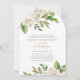 Affordable custom printed First Communion invitations with an elegant painted floral border in white, green and faux gold foil accents. Personalise the template with your event details or use the design tools to customise the text, choose any background colours and edit the fonts to create your own unique invitation design. Reverse side features a pretty sage green background or use the space to add additional text or photos if needed. This beautiful neutral floral design is perfect for any season.