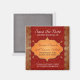 Faux golden edges make a gilded border for this Indian inspired save the date magnet. The background is a deep red with a subtle pattern overprinting it all to enhance an ornate frame containing customised text. The frame is surrounded by four small golden paisley ornaments. Available with matching products.