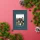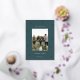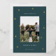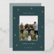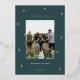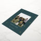 A modern and elegant Christmas holiday card design featuring a single vertical photo on a forest green background dotted with gold foil pine trees. Personalise with your custom holiday greeting, family name and the year beneath.