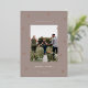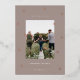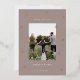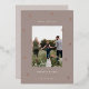A modern and elegant Christmas holiday card design featuring a single vertical photo on a neutral taupe background dotted with rose gold foil pine trees. Personalise with your custom holiday greeting, family name and the year beneath.