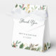 These gorgeous holiday wedding favour boxes feature elegant faux gold leaves, Christmas greenery, and red holly berries on a modern white background. The front flap says "thank you" in elegant calligraphy.