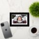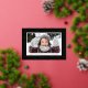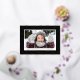 Elegant holiday photo card featuring your horizontal photo framed with a white border and beautiful gold foil snowflakes on a black background. Personalise the gold foil snowflake holiday card with a custom holiday greeting and your family name. The foil holiday card reverses to display a solid black background