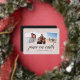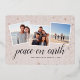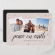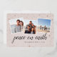Elegant and festive holiday photo card features three square photos in a collage layout, with a border of shining rose gold foil stars and snowflakes on a pale cameo blush background. "Peace on Earth" or your custom greeting appears along the bottom in white calligraphy script lettering, with your names or family name and the year beneath.
