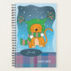 A blue , orange and purple planner featuring a cartoon ginger cat wearing a green hat and scarf , standing in the snow on a cold winter day . Personalise it with a name and the year . Great for school , the office or home .