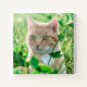 Photograph of a ginger cat with pale green eyes sat in long green grass.