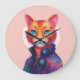 Pictured is a ginger cartoon cat in a colorful cyberpunk design