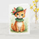 This design shows an anthropomorphic ginger kitten centered in the scene, looking straight ahead with luminous emerald-green eyes that feel like they’re holding a tender gaze for someone special 💚. It wears a forest-green bowler hat decorated with small red and peach flowers tucked among green leaves, echoing the kitten’s eye color. A matching ruffled collar circles its neck, giving it a dressed-up look that reads like a friendly date or a sweet meeting in the park. The fur is orange and white with soft striping, and the tiny pink nose and faint smile add a gentle, affectionate expression. The background is a light green wash that suggests a quiet meadow, with a few tiny white blossoms and thin blades of grass scattered around. St. Patrick’s Day text sits near the top in green lettering, with a smaller line below in a softer green, and a little ☘️ accent nearby. Light green tones spread outward behind the kitten, with delicate white flowers dotting the lower area like confetti across the grass.