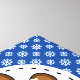 Gingerbread man cookie on a blue white snowflakes pattern background with caption "Merry Christmas".