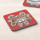 Photographs of three homemade and decorated gingerbread boy cookies on cranberry (customisable) background colour.