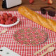Linda Baysinger Peck’s cute, gingerbread cookies, with red and white peppermint candies, on red background.