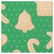 This cute holiday cotton fabric features a pattern of tan gingerbread cookies of stockings, gingerbread men, candy canes, bells, Christmas trees, and more on a background of green with white dots. Designed by artist Susan Coffey.