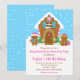 This cute and festive birthday invitation features a cute gingerbread house decorated with pink and green candy. Beside it are adorable gingerbread men with gifts, dressed in Santa hats and a scarf. In the background is a bright blue winter sky with elegant falling snowflakes. The text combines decorative and sans serif fonts for a stylish and modern look. This is perfect for a Christmas gingerbread house decorating party.