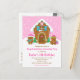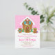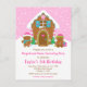 This cute and festive birthday invitation features a cute gingerbread house decorated with pink and green candy. Beside it are adorable gingerbread men with gifts, dressed in Santa hats and a scarf. In the background is a bright pink winter sky with elegant falling snowflakes. The text combines decorative and sans serif fonts for a stylish and modern look. This is perfect for a Christmas gingerbread house decorating party.