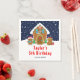 This cute and festive napkin features a cute gingerbread house decorated with red and green candy. Beside it are adorable gingerbread men with gifts, dressed in Santa hats and a scarf. In the background is a navy blue winter sky with elegant falling snowflakes. The text combines decorative and sans serif fonts for a stylish and modern look. This is perfect for a Christmas gingerbread house decorating party.