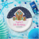 This cute and festive plate features a cute gingerbread house decorated with pink and green candy. Beside it are adorable gingerbread men with gifts, dressed in Santa hats and a scarf. In the background is a navy blue winter sky with elegant falling snowflakes. The text combines decorative and sans serif fonts for a stylish and modern look. This is perfect for a Christmas gingerbread house decorating party.
