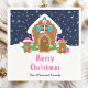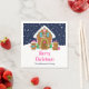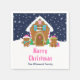 This cute and festive napkin features a cute gingerbread house decorated with pink and green candy. Beside it are adorable gingerbread men with gifts, dressed in Santa hats and a scarf. In the background is a navy blue winter sky with elegant falling snowflakes. The text combines decorative and sans serif fonts for a stylish and modern look. This is perfect for a Christmas gingerbread house decorating party.