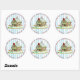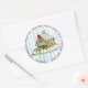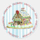Blue and colourful Christmas sticker with a whimsical gingerbread house and blue and white stripes.