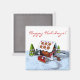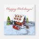 This design features an illustrated Gingerbread House with candies and cookies, a snowman, snow tipped trees and a sleigh full of gifts.