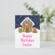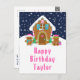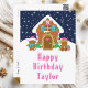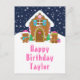 This cute and festive birthday postcard can be personalised with a name or title such as daughter, granddaughter, niece, friend etc. The design features a cute gingerbread house decorated with pink and green Christmas candy. Beside it are adorable gingerbread men with gifts, dressed in Santa hats and a scarf. In the background is a navy blue winter sky with elegant falling snowflakes. The text is in a bold and festive font. This is perfect for Christmas and the winter holiday.