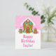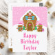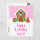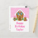 This cute and festive birthday postcard can be personalised with a name or title such as daughter, granddaughter, niece, friend etc. The design features a cute gingerbread house decorated with pink and green Christmas candy. Beside it are adorable gingerbread men with gifts, dressed in Santa hats and a scarf. In the background is a bright pink winter sky with elegant falling snowflakes. The text is in a bold and festive font. This is perfect for Christmas and the winter holiday.