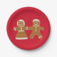 Gingerbread with white frosting cookie man and woman couple hold hands on a red holiday season background.