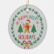 Celebrate the magic of the season with this adorable ceramic Christmas ornament. Featuring a charming gingerbread man holding a sweet candy cane, framed by lush pine trees and a festive holly wreath adorned with a bright red bow. The cheerful 'Happy Holidays' message and 'Joy' tag make it the perfect addition to your holiday tree or a thoughtful gift for loved ones. Crafted from high-quality ceramic, this ornament brings a touch of whimsical warmth to any home during the most wonderful time of the year.