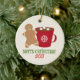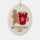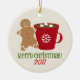 A Christmas Ornament featuring an illustration of a gingerbread man standing to the left of a red mug (with snowflake) filled with hot chocolate and three marshmallows. Green text says "Merry Christmas!" Personalise the red text with year.