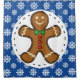 Gingerbread man cookie on a blue white snowflakes pattern background.