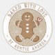 Here's a happy little gingerbread man with little heart 'buttons’ on his shirt and a warm red heart in his hand on a backdrop of dainty iced gingerbread snowflakes. Enjoy the Season! Add your own message or personalise with your name and address to use as an envelope seal! Great for bakers or as a little gift for your favourite baker, or for anyone who loves gingerbread!