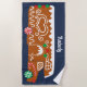 This personalised beach towel makes a perfect Christmas gift for RV owners. It features an illustration of a gingerbread RV. This festive cookie camper is decorated with white icing and red and green candy and set against a navy blue background. The towel is ready to be personalised with a name or other custom text at the top.