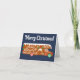 Both the message on the front and the message on the inside of this card can be customised with your own text. This Christmas card features an illustration of a gingerbread RV. This festive cookie camper is decorated with white icing and green and red candy. The graphic is set against a navy blue background.