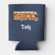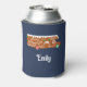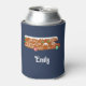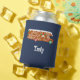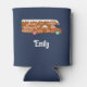 Create a small personalised gift that's perfect for RV owners. This foam can sleeve features an illustration of a gingerbread RV with a name below in white lettering. This festive cookie camper is decorated with white icing and red and green candy. The graphic and text appear on both the front and the back of this navy blue can holder.