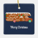 The front of this Christmas ornament features an illustration of a gingerbread camper. The festive cookie RV is decorated with white icing and red and green candy and set against a navy blue background. The "Merry Christmas" message below the graphic can be personalised with your own text. The reverse side of the ornament is ready to be customised with your own photo, perfect for sharing a vacation memory.