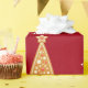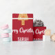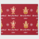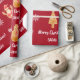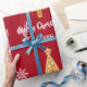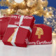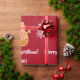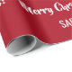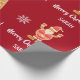 Modern Christmas gift wrap for kids, with an elegant design that includes a gingerbread snowman, Xmas tree, and Santa, snowflakes, the greeting "Merry Christmas" in stylish typography, and a personalised name. On a red background.