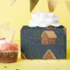 Wrapping paper with a cozy illustrated gingerbread village pattern on a deep blue background, featuring warm-toned houses, evergreen trees, and delicate snowy accents. The repeating design feels calm, nostalgic, and storybook-inspired.