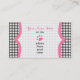 A business card great for a pet spa and salon or a pet groomer. Background is black gingham on both sides. Pink trim on both sides. Front features a black and white photo of a Jack Russell with a pink ear. Personalise the text on front and back.