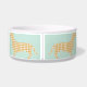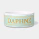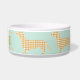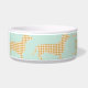 Cute cream gingham dachshunds circle this mint dog bowl that is personalised with your little sausage dog's name in a classic serif font on the centre of the bowl. Match your dog's dinnerware to your farmhouse kitchen. This classic pattern and colour scheme is also great for preppy pup parents and cottagecore aesthetics.