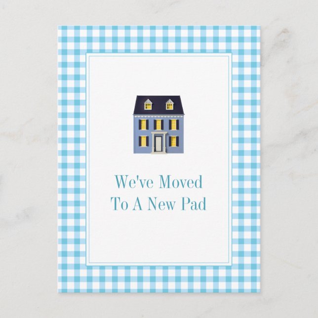 A moving announcement postcard that echoes that warm, homemade feel using a sky blue gingham pattern. An image of a dollhouse is used to provide a tongue-in-cheek reference to your new home. The gingham pattern is repeated on the back to offset your new address and contact information. You can also customise this to make a cute housewarming party invitation. Available in alternate colours with matching products.
