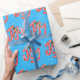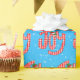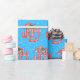 Cute snowman on red and white gingham JOY fun font style with snowflakes on an aqua background.